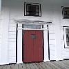 - wood shingle cladding with plain wooden cornerboards and a plain wooden frieze under roof eaves;