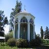 - l'édicule en bois peint ouvert sur quatre côtés, dont le plan carré, le petit escalier, le toit à quatre versants à larmiers retroussés, couvert en tôle à la canadienne et surmonté d'un mât, les piliers cannelés surmontés de chapiteaux doriques, les arcs surbaissés, le garde-corps menuisé et les clés décoratives;